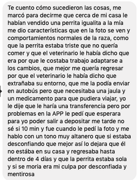 3.- El estafador llama el dueño y dice que mandará a la mascota en Uber o con un conocido, que no puede enviar fotos de la mascota por que esta en su trabajo, su cámara está descompuesta, es una persona mayor etc.. y pide solamente el $ del Uber, o de la gasolina.